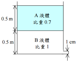 【已刪除】二、如圖所示之容器,下方有一直徑為 1 cm 的出口,容器內裝不會互相混合的兩種液體, 其中上層 A 液體的比重為 0.7,下層 B 液體的比重為 1,假設無任何的能量損失, 請計算出口處的流量大小為何?(25 分)