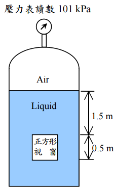 【已刪除】四、有一壓力容器如圖所示,上有一長寬均為 0.5 m 的正方形視窗,容器內裝比重為 1.2 的液體,且本壓力容器的壓力表讀數為 101 kPa,請問該容器上的正方形視窗受力 為何?(25 分)