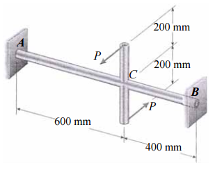 = 40mm,兩端 A 及 B 均為固定端。兩水平力 P 分別作用於垂直臂之兩端如圖所 示,若鋼管之容許剪應力(allowable shear stress)為 45MPa,試求水平力 P 之最大 值為多少?(20 分)