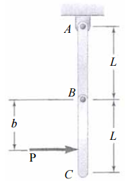 【已刪除】三、AB 及 BC 之均勻桿以插銷(pin)連接於 A 及 B,兩桿之質量均為 3kg、長度均為 L = 625mm,一水平力 P = 25N 作用於 BC 桿上,若 b = 500mm,試求此二桿中心點 之加速度及其角加速度各為多少?(20 分)