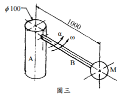 【已刪除】三、一呈鉛直置放之圓柱形轉軸 A,其頂部水平設置一圓桿 B,該圓桿 B 之末端連接一 均質鐵球 M,如圖三所示,長度單位為 mm,若圓桿 B 之質量忽略不計,鐵球 M 之質量為 80 kg,轉軸 A 自靜止以等角加速度 α = 10 rad/sec
