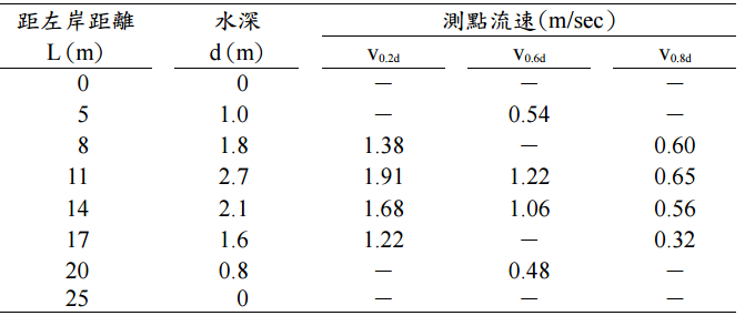 【已刪除】二、某河川斷面距左岸 L 公尺處之垂直測線上各測點之流速如下表,試依平均斷面法求 該河川流量。(20 分)