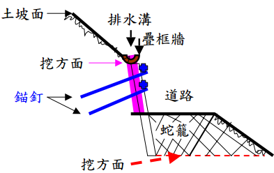 【已刪除】三、臨時性邊坡保護工法中有一種 Krainer(暫譯為疊框牆)之應用方式如下圖,試說明 其可能的優點(5 分)、缺點(5 分)及用途(5 分)。