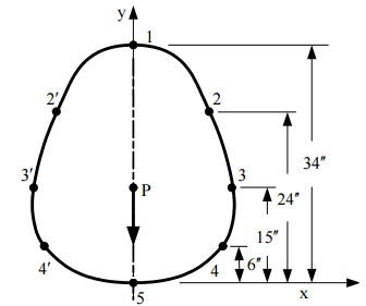 【已刪除】二、假設一機身結構之橫截面如下圖,為對稱形結構共有八根加強條(1, 2 , 3, 4 , 5 , 2′,3′,4′),每根加強條斷面積為 0.1 平方英吋,假設機身截面受 P = 1000 lb力量向 下,求各蒙皮(skin)上的剪力流(shear flow)。(25 分)