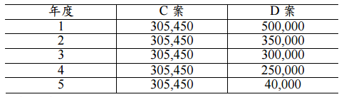 【已刪除】四、設有 C 與 D 兩種公共投資方案,均須投入 10 億元,各方案皆可使用 5 年,各年的 淨收入(千元)如下表所列:
