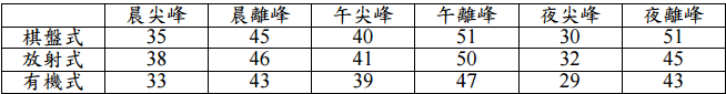 【已刪除】一、根據理論,城市路網的設計型態對行車速度有所影響,今於甲國任選 3 座不同路網 的城市,發現其在各時段主要道路的行車速度(公里/時)如下表所列: