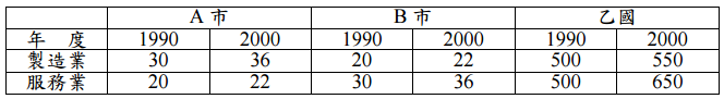 【已刪除】二、今由乙國抽出 2 座城市(A 與 B),調查其 1990 及 2000 年各產業就業人數(萬人), 並將全國資料並列為下表: