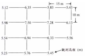 【已刪除】五、某一工地擬進行地面整平工程而實施面積水準測量,測樁分布及水準測量結果如圖, 請計算全區最低點以上的土方量、土方平均高程、及施工基面高程。(20 分)