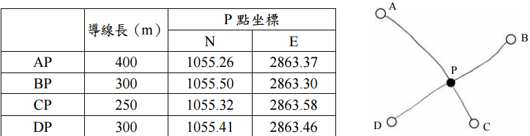 【已刪除】四、如圖 AC 及 BD,兩導線相交於 P 點,已知 A、B、C、D 四導線點算得 P 點之坐標 及導線長如下:(20 分)