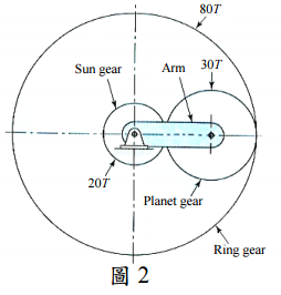 【已刪除】六、圖 2 所示之行星齒輪系中太陽齒輪、行星齒輪及環齒輪的齒數分別為 20、30 及 80 ,若環齒輪為固定不動,太陽齒輪以 100 rpm 的轉速順時針方向轉動,試計算行星 臂之轉速及轉動方向。(20 分)