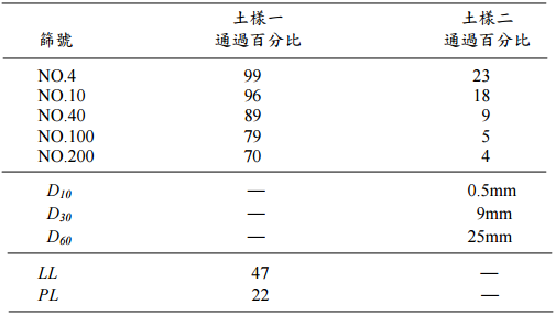 【已刪除】五、兩土壤試樣經篩分析及阿太堡限度(Atterberg limits)試驗後之結果如表所示,試根 據統一土壤分類法(Unified Soil Classification System, USCS)分類並解釋分類步驟。 (20 分)