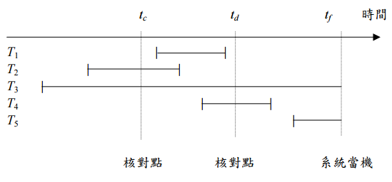 時,系統完成核對點(checkpoint)檢查,並將核對後 的結果寫入硬碟資料庫中。如果系統在時間 t