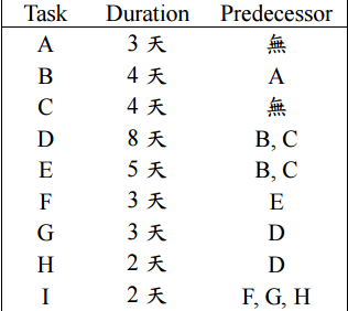 【已刪除】五、下表為某一專案的所有工作項目(Task)、預估執行時間(Duration)及其前置作業 (Predecessor),請畫出該專案的 PERT 圖(計劃評審技術,Program Evaluation and Review Technique)及說明如何算出該專案最少的執行時間。甘特圖(Gantt Chart) 也是專案工作時程管理的工具之一,請說明使用 PERT 圖來取代 Gantt Chart 作專案 工作時程管理的好處。(20 分)