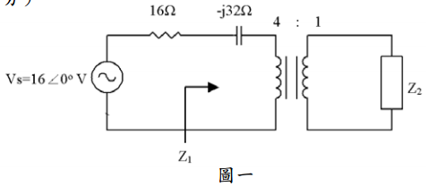【已刪除】三、如圖一所示為理想變壓器電路,已知圈數比 n=4,若負載 Z