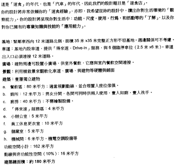 2.建築立面圖(1:50,正立面圖’査張):圖說交代建築外型、門窗、招牌等。建築立面元素 的尺度應與12米道路上行駛的汽車速度有關。本店店名:「速食一號」。