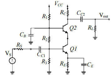 【已刪除】三、下圖為 Cascode 雙載子電晶體放大電路,其中 Q2 基極交流旁路電容 C