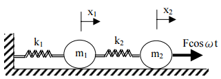 【已刪除】四、試求下圖中兩質量點 1,2 構成系統的運動方程式。(其中,m 為質量,k 為彈簧勁 度,x 為位移量,Fcosωt 為外力,二質量均不會滾動只會滑動,滑動時之摩擦消耗 可忽略不計)(25 分)