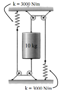 【已刪除】一、如圖所示之系統, k 為彈簧常數(spring constant),圓柱體(cylinder)之質量為 10kg,假設在忽略滑輪(pulley)之質量與摩擦力及假設該兩彈簧在任何時間皆是 處於被拉伸之情況下,試求該系統之自然頻率。(25 分)
