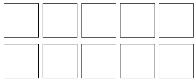 【已刪除】五、請於十個連續排列成二排之三公分邊長之正方形方格內(如下圖所示)運用垂直線 與水平線之線條(每張正方形方格內之線條總數不超過五條),構成一具韻律感變 化之連續圖形。(20 分) (請將下圖繪製於試卷上依題意作答,於本試題上作答者不予計分)