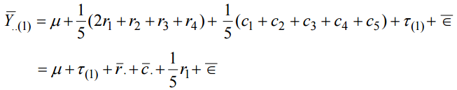 這種表示法在非直交性的資料下並不是有意義的 請根據試驗配置圖與模式寫出各處理平均值 , 的模式 Y..(1) , Y..( 2) , Y..(3) , Y..( 4) 並根據這些平均值的模式回答為何不是有意義的。註:這與變績分 析時,情形相類似,要將校正後的處理均值(adjusted treatment means)呈現出來而不是將通 常的處理平均值呈現出來。( 8 分) 提示:下列是參照數據中配置圖所寫出的第一個處理(處理 A)的平均值模式