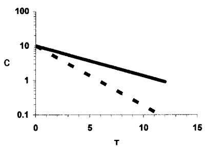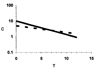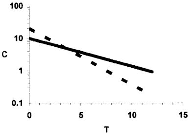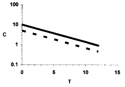 51 某藥品之體內動態遵循線性一室模式。當分布體積變成原來的兩倍,且清除率變成原來的兩倍時,若給藥劑量維持不變,請問下列何者正確地描述改變前(實線)與改變後(虛線)血中濃度(C)與時間(T)關係圖之變化?