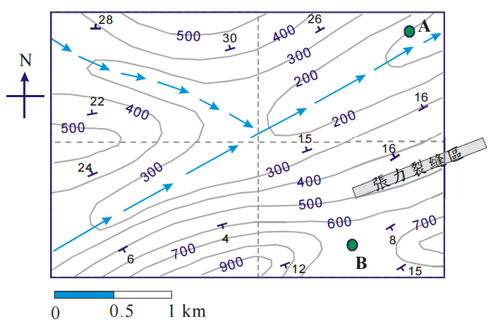【已刪除】一、山區之地形圖如下圖,表土層厚度約 1 至 2 米,現擬建立連結 A 點至 B 點之公路。 請將下圖大致描繪於答案卷,並於其上標出合理之公路路線、說明此區域可能之地 質構造、定線的理由及沿線可能遭遇之工程問題。(25 分) 註:等高線高程差 100 公尺,露頭所量得之傾向標於圖中且傾角單位為角度,箭頭 為河流及其流動方向,岩層界面摩擦角約為 10~18 度。