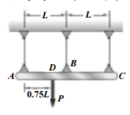 二、下圖顯示一長度為 2L 之水平剛性桿件藉三條繩索分別於 A 、 B 、 C 三處懸掛著,三 條繩索之材料性質相同,但中間繩索之斷面積僅為兩邊繩索斷面積之一半,今桿件 在 A 點右邊 0.75 L 處(D)受到一大小為 P 之向下外力,假設繩索之變形在線彈性範 圍內,請問各繩索所受到之拉力為何?(25 分)