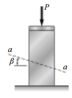 三、下圖顯示一力量 P 加諸於一柱中心,已知圖中 a-a 斷面所受到之壓應力為 100 MPa、 剪應力為 35 MPa,請問 a-a 與水平面的夾角 為何?而該柱所受到之最大壓應力又 為何?(25 分)