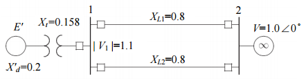 【已刪除】五、如圖所示之電力系統中,60Hz 同步發電機與系統 MVA 基準值相同,同步發電機之 暫態電抗為 0.2 標么,慣性常數為 5.66MJ/MVA。在相同的基準下,變壓器與二條 輸電線路之電抗標么值標示於圖上,無限匯流排 2 的電壓亦如圖示。發電機傳送 0.77 標么之實功率至匯流排 1,匯流排 1 之電壓大小為 1.1 標么。若在匯流排 1 發 生三相短路故障,故障阻抗為 0.082 標么,並假設發電機之激磁電壓不變,試求故 障期間之搖擺方程式(Swing Equation)。(20 分)