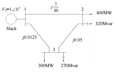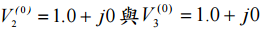 標么,在 匯流排 2 與匯流排 3 的負載則標示於圖上,輸電線路阻抗則以 100MVA為基準之 標么阻抗標示於圖上。忽略輸電線路電阻與並聯電容效應,試利用高斯賽達法( Gauss-Seidel)進行一次疊代後,求出匯流排 2 與匯流排 3 的電壓V