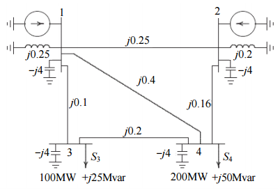 【已刪除】四、如圖所示之三相電力系統,以 100MVA為基準時,在匯流排 1 與匯流排 2 的發電機 係以其標么電抗及等效電流源表示,線路則以π模型及標么表示;在匯流排 3 與 匯流排 4 的負載則以MW與Mvar表示。假設匯流排 3 與匯流排 4 之電壓各為 1 標 么,試將負載轉換為標么阻抗,再求此系統之導納矩陣Y