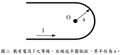 【已刪除】三、一長金屬導線形狀如圖二所示,右端成半圓弧狀,半徑為 a,導線上電流為 I,推導 圓弧中心點 O 之磁通量密度(magnetic flux density)B 值及方向。(15 分)