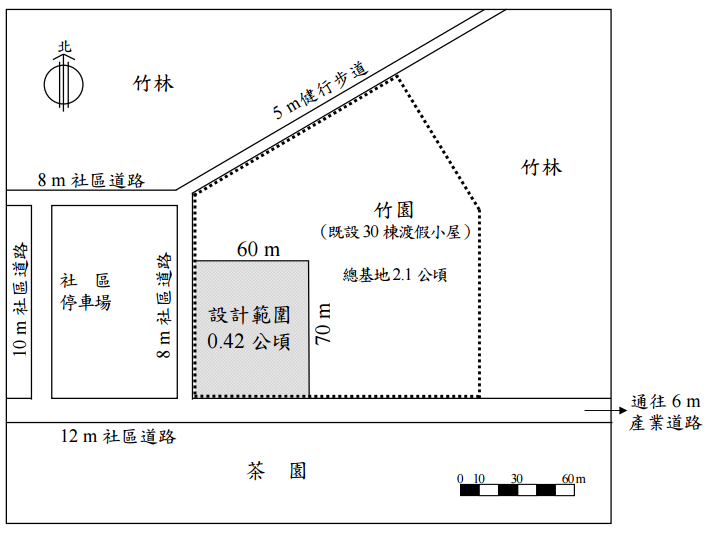 ),管理室(管理員 2 人、工友 1 人)(24 m2)及 櫃 枱 服 務 員 2 人。12其他空間:配合主空間以外所需附屬空間及公共服務空間,如:走廊、通道、 斜坡、樓梯、電梯、公用廁所、置物間及室外設施與活動等。 三、基地環境: ⑴本基地(如基地圖)位於北、中、南區域(由設計人自選定之)海拔 500 公尺之 台地,區位選定後應於建築計畫中彙整並確定自然氣候環境之基本資料,以供設 計之參據。 ⑵企業總部所持有基地屬都市計畫風景區(建蔽率 20%、容積率 60%)總面積約 2.1 公頃(圖中虛線範圍),東邊與北邊均為廣大竹林,並延伸入基地東北側(竹 園內有 30 棟渡假小屋),僅剩 0.42 公頃空曠地,位於基地西南角作為本案實際 基地。 ⑶基地北側臨 5 m 風景區之健行步道(往東北方向最遠可達高山登山口),於中段 可通往不同景點及遊客服務中心,可讓遊客有 60 分鐘、120 分鐘、3 小時與 5 小 時等不同路程之選擇。 ⑷基地西側臨 8 m 社區道路,並與社區停車場為鄰,因而本基地可免設大小客車的 停車空間,惟需預留乘客及物料上下裝卸空間。位於停車場之西側則為約 200 戶 之社區,絕大部分均為磚牆雙斜水泥瓦 2 層以下房舍,沿街商店林立,各項生活 所需均相當齊全。 ⑸基地南側臨 12 m 社區道路,向東延伸即為通往山區之 6 m 產業道路皆可到達各 景點。道路以南均為茶園,且於西南方向可觀賞夕陽,晚上可見山腳下都市燈景, 視野相當不錯。 四、計畫與設計成果表達: 依前人立論得知,建築計畫學是一種專門研析人類生活來建立建築知識,與建構建 築設計基本理論的學問。建築計畫即是以科學的方法將生活現象加以分析,建立基 本資料與數據,並將生活行為法則歸納成設計準則,及將業主(使用者)需求,轉 成設計條件,再確認其可行性分析後彙整,以作為操作建築設計的依據,因此可以 說:「計畫是尋找課題,設計是解決問題」。 ⑴建築計畫部分:(40 分) 基於上述立論並配合前面題旨、需求及基地環境說明,請以文字陳述或概念圖針 對下列各項,將之轉成設計條件,以利建築設計之操作。 規劃目標與構想:依需求如何將企業形象或品牌意象來凸顯本設計方案的目標, 設計者應予“具象”表明,並提出適宜可行之構想概念。 基地與環境分析:依基地環境說明,應先確認本基地區位之自然氣候環境及基 地特性分析彙整基本資料以供設計操作之參考。 空間定性與定量:依業主(使用者)所提空間需求,在空間質與量尚未完全確 定,請以餐廳空間為例,進行定性定量分析後,依此經驗,再將全部空間之量 與質及空間組織加以確認,做為設計之依據。 設計課題與準則:依題旨、需求及基地環境說明內容之研判,擬依那幾項課題 納入設計來操作者,並確定其設計準則。