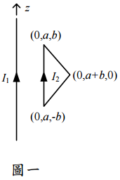 【已刪除】二、一長直導線沿 z 軸無限延伸,另有一導線形成一三角形電流迴路,其端點分別為 (0, a, b)、(0, a+b, 0)、以及(0, a, -b),其中 a 及 b 為正常數(如圖一)。求此兩導線 間的互感量(mutual inductance)。(20 分)