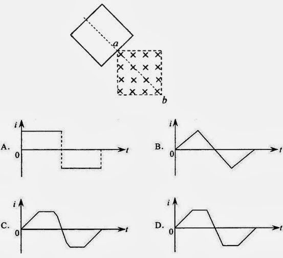 21.如图,一个边长为l的正方形虚线框内有垂直于纸面向里的匀强磁场;一个边长也为l的正方形导线框所在平面与磁场方向垂直;虚线框对角线ab与导线框的一条边垂直,ba 的延长线平分导线框。在t=0时,使导线框从图示位置开始以恒定速度沿ab方向移动,直到整个导线框离开磁场区域。以i表示导线框中感应电流的强度,取逆时针方向为正。下列表示i—t关系的图示中,可能正确的是