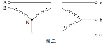【已刪除】三、圖三所示為一由 3 台規格完全一樣的單相變壓器連結而成之 Y- 結線三相變壓器組, 在某一相繞組因故障而移除後的結構圖。試問在此結構下是否仍能繼續供電?是否 仍能繼續供電給三相負載?最大可供應多大容量的負載(以原完整三相結構時之變 壓器三相容量為基準,以百分值表示)?(15 分)