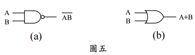 【已刪除】五、反及閘(NAND gate)與或閘(OR gate)的符號分別如圖五(a)與(b)所示,試利用三 個反及閘來代替一個或閘,繪出其邏輯電路並標示各級的輸入、輸出。(10 分)
