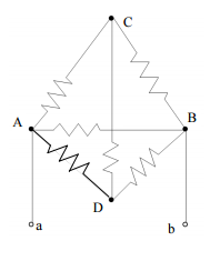 【已刪除】六、如圖電路總共有六個電阻,AC= 8Ω,CB=2Ω,BD= 4Ω,AD=16Ω,CD= 30Ω, AB=20Ω。ab 之間的等效電阻等於多少?(20 分)