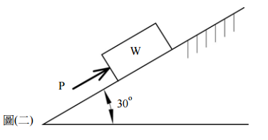 17. 如圖(二)所示,一物體置放於粗糙之斜面上。若物體之重量 W 為 300 N,靜摩擦係數 µ s 為 0.5,斜面之傾斜角為 30