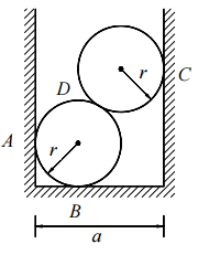 【已刪除】三、如圖所示,二個半徑皆為 r = 8 cm、重量皆為 100 N 的均勻圓盤置於二個距離為 a = 24 cm 的垂直壁間。若重力的方向為垂直向下、且所有的接觸面間都沒有摩擦力, 試求圓盤在接觸點 A、B、C 的反力。(20 分)