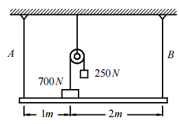 【已刪除】二、一重量為 200 N 的均勻直桿由二條垂直的繩索 A、B 懸吊在如圖所示之水平位置上, 直桿上有一 700 N 的重物,該重物與另一 250 N 的重物經由一繩索懸吊在一滑輪上, 若重力的方向為垂直向下,試求繩索 A、B 所受的張力。(20 分)