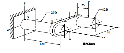 【已刪除】二、下圖所示為一曲柄受 F=1200 N 之力,軸 AB 是由 AISI 1020 熱壓鋼製成,其降伏 強度為 210MPa。請以 A 點之應力狀況為依據用畸變能理論(Distortion Energy Theory)計算其安全係數為若干。(25 分)