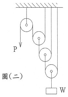 8. 如圖(二)所示複式滑車,若重量W上升的線速度為2cm/min,則作用力P的線速度應為_______cm/min。