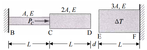 =3A。B端及F端為固定端 ,CD及EF兩桿之間有空隙d。在C點施加外力PC,並在EF桿均勻加熱,使EF桿全桿 溫度皆上升ΔT的溫度。假設BC及CD兩桿之溫度不變,同時PC及ΔT已超過使桿件 BC、CD及EF形成串聯所需之最小值。試求BC桿、CD桿及EF桿之內力F1,F2,F3。 (20 分)