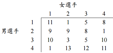 【已刪除】三、一網球教練負責組成 4 隊男女混合雙打隊伍。根據過去的比賽紀錄,入選的男女各 4 位選手搭擋效益如下表所示: