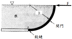 【已刪除】一、如圖所示,閘門形狀為四分之一圓,半徑 R= 6.00 m,寬(垂直紙面方向)為 10.0 m, A 為鉸鏈,其摩擦可忽略。試求水作用在閘門之水平力為何?垂直力為何?水平力 對鉸鏈之最短力臂為何?已知垂直力對鉸鏈之最短力臂為 2.55 m,閘門重量不計, 維持閘門在圖示位置所需之水平力為 F,試求 F 之大小為何?(25 分)