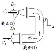 = 150 mm。水由截面(2)噴入大氣。在x方向,試求固定此彎管所需之力及 其方向為何?(25 分)
