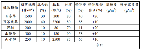 【已刪除】五、植生方法之噴植工法係以目的種子加噴植材料成為混合基材,噴植於坡面,以達到 植生之目的。其混合種子之播種量,需經多項參數計算而決定之。若選擇道路邊坡 施工,噴植厚度為 7 公分,噴植損耗 18%時,請依下表所提供資料計算每平方公尺 之播種量及每立方公尺種子之需要量為何?(20 分)