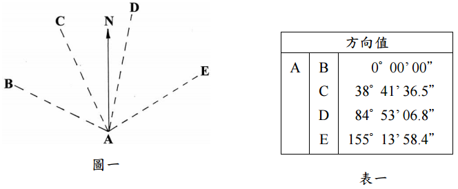 【已刪除】二、假設測站 A 觀測 D 的方向(A, D)之方位角為 12° 43’ 51.6",請計算下列各方向 之方位角。(10 分)