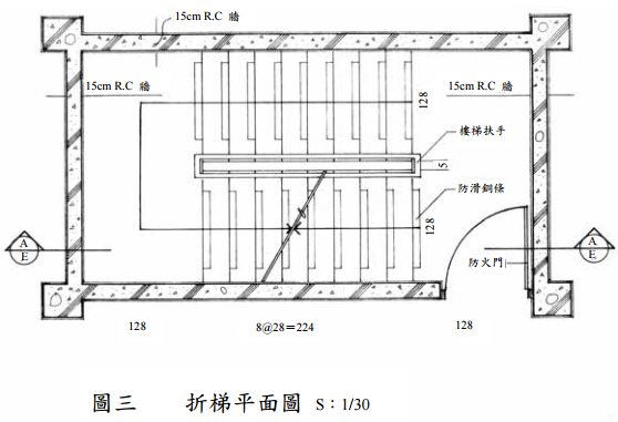 【已刪除】六、請依圖三之標準層 RC 折梯平面圖之剖面線繪製上層與下層連續的折梯剖面圖 (scale:1/30),樓高 300cm。(梯間淨寬 128+5+128cm,淨長 128+224+128cm) (30 分)